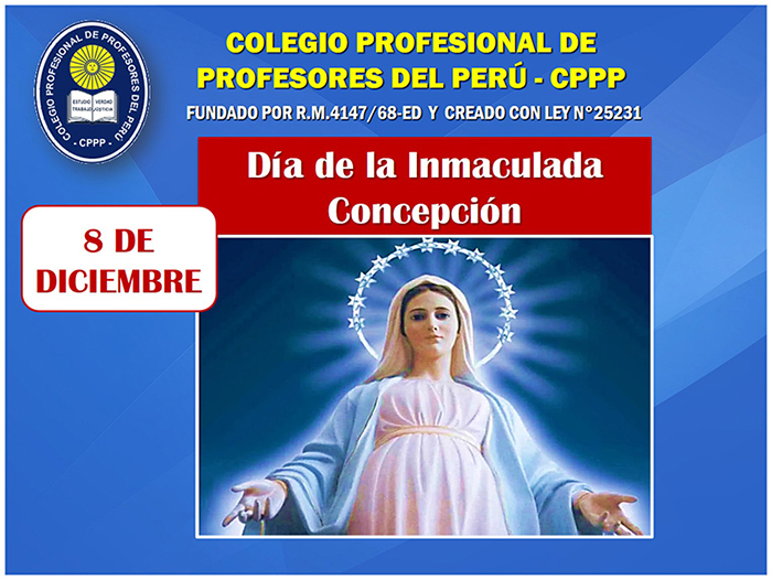 El Día de La Inmaculada Concepción de la Santísima Virgen María, conocida también como la Purísima Concepción, es una festividad cristiana que se celebra el día 8 de diciembre en el Perú y el mundo.